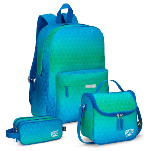 Roots Essential 3-in-1 Matching Water Resistant Kids Backpack and Lunch Bag Set with Bonus Pencil Case - Made from 100% Recycled Fabrics -22.5 litres, Ombre Blue Green
