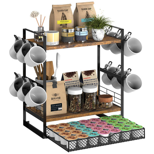 OGEMXU Coffee Station Organizer, 3 Tier Bar Organizer for Countertop, Mug Cup Holder Stand With 12 Hooks and 28 K Cup Storage for Kitchen, Home & Office, Rustic Brown
