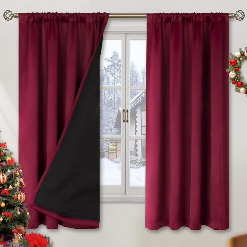 BGment Christmas Thermal Insulated 100% Blackout Curtains for Bedroom Decoration with Black Liner, Double Layer Full Room Darkening Noise Reducing Rod Pocket Curtain (52 x 63 Inch, Red, 2 Panels)
