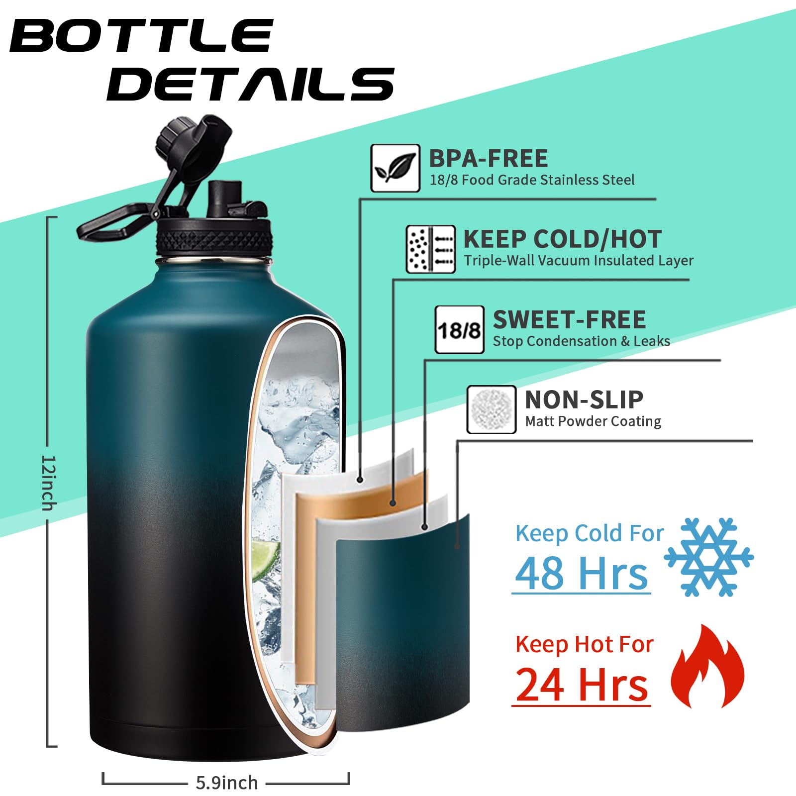 - TRIPLE-INSULATION & HIGH-PERFORMANCE: This wide mouth 1 gallon water bottle features triple-wall vacuum insulation and pro-grade stainless steel, it keep-cold for 48 hrs and keep-warm for 24 hrs without altering the taste and keeps your water tasting fresh. Using this metal water bottle on hot summer days or your next camping trip to stay hydrated all the day