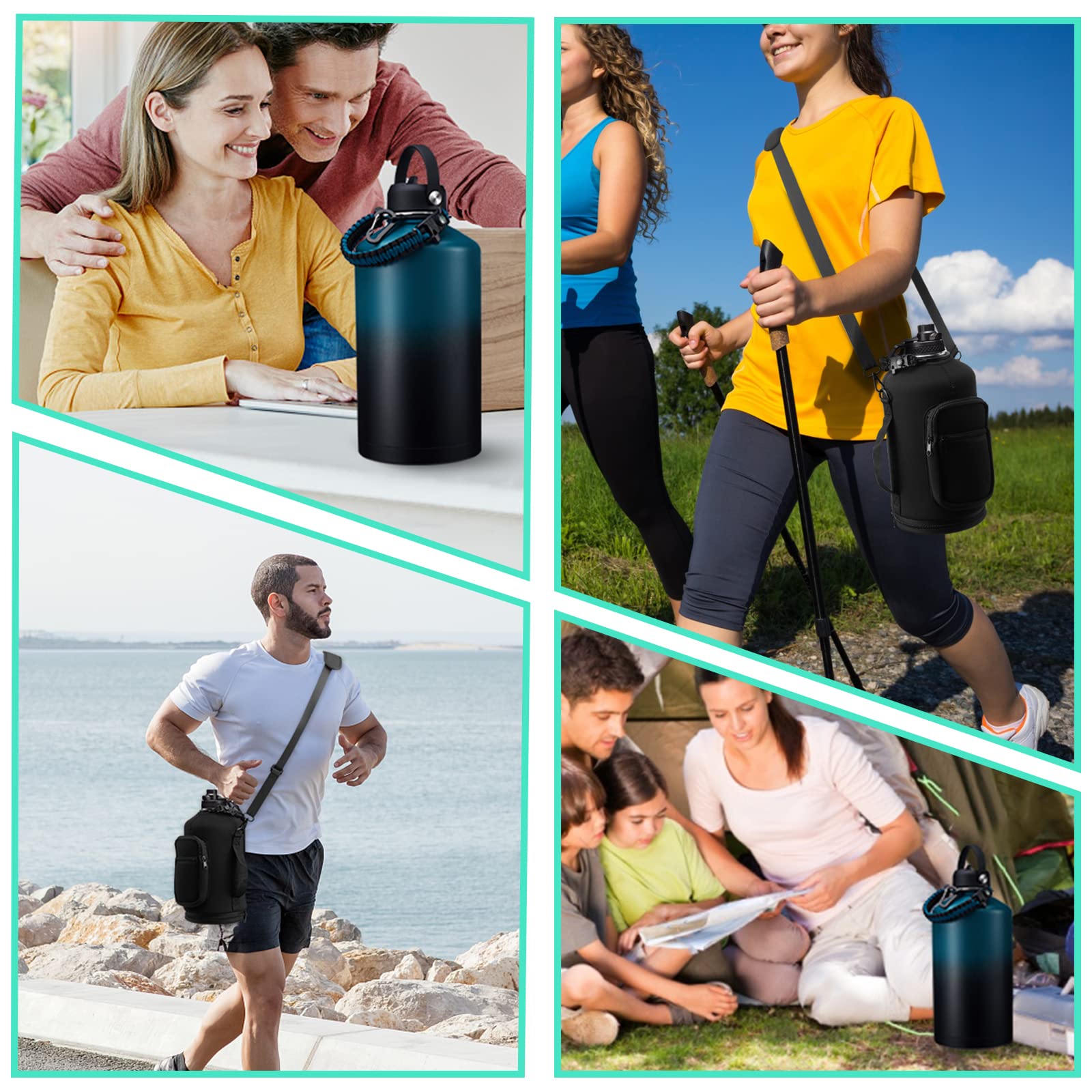 - PROTECTIVE BOOTS & STORAGE SLEEVE: Upgraded silicone boots prevent shattering and cracking when stainless steel water bottle accidental dropped. And storage carrying pouch with removable shoulder strap for convenient hands free carrying! The safe zippered pocket design to stores all your stuff, holds your cards & phone & key