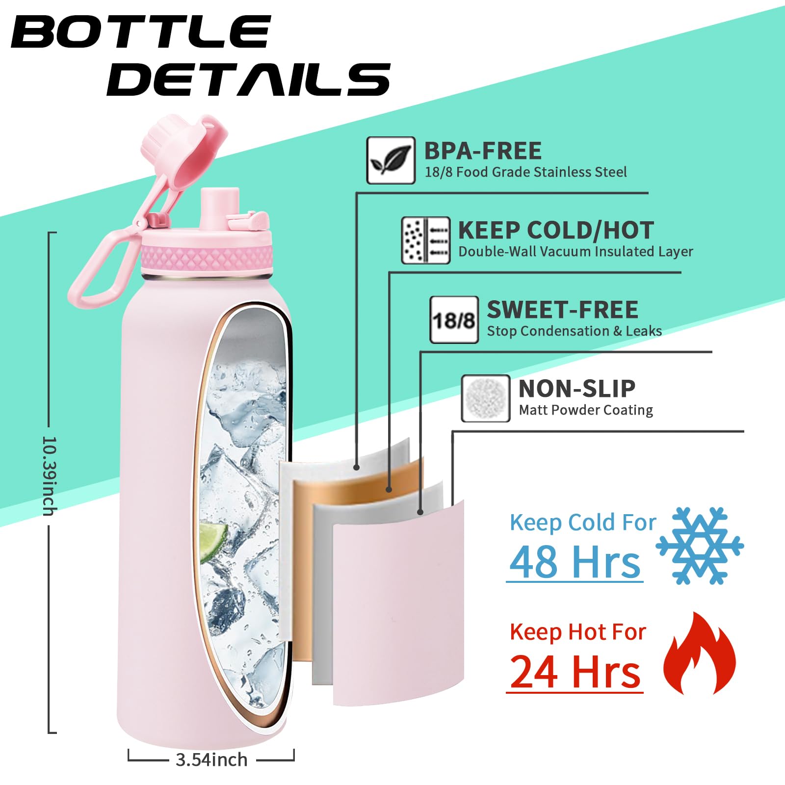 - QUALITY—Latest Vacuum Insulated: metal water bottle featuring double-wall & food-grade 18/8 stainless steel with superior insulation & anti-condensation, keeping your beverages stay ICE COLD for 48-Hours & HOT for 24-Hours for a fresh taste. In addition, the outer layer with non-slip powder coating ensures drinking bottles won't sweat & that keeps it from slipping