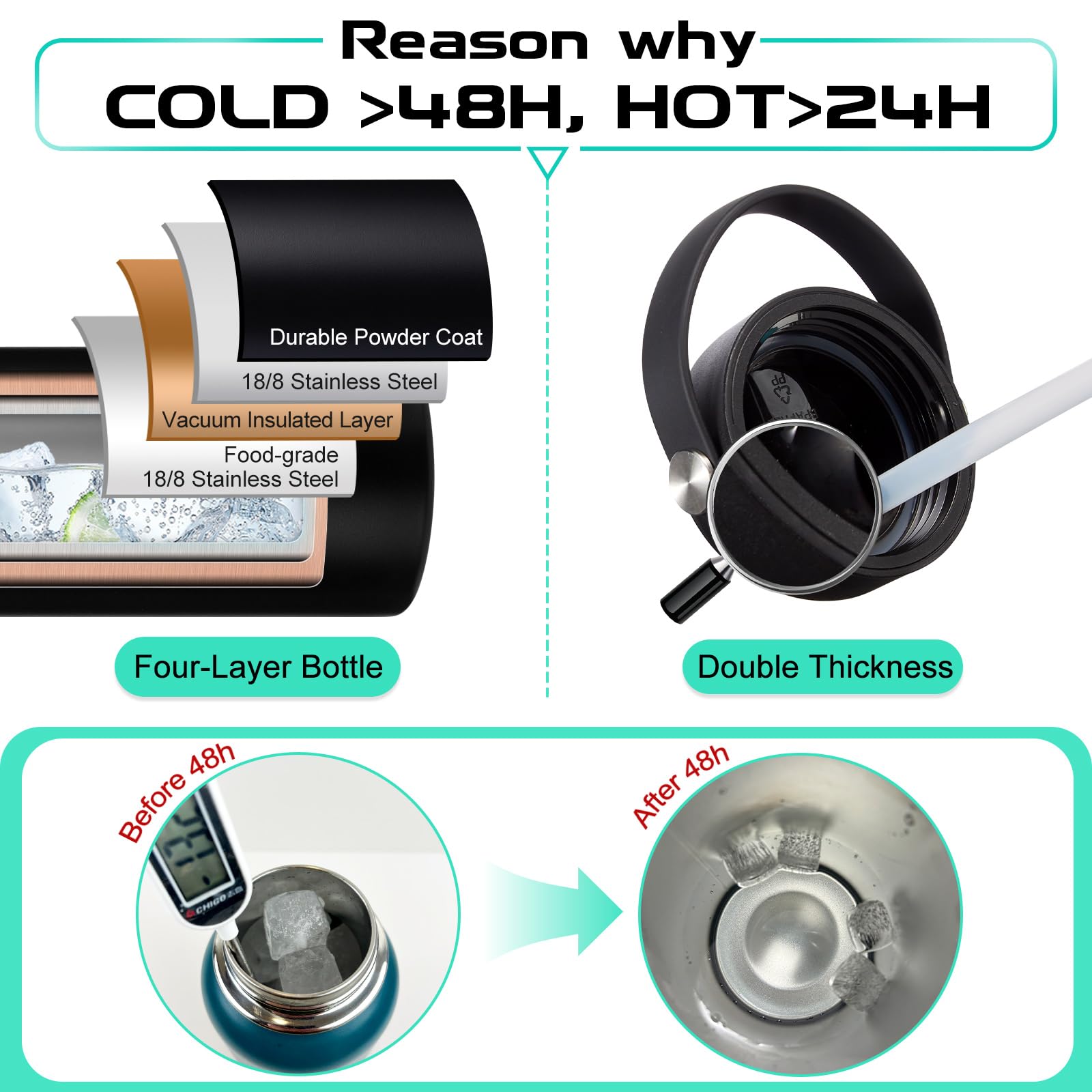 - QUALITY—Latest Vacuum Insulated: metal water bottle featuring double-wall & food-grade 18/8 stainless steel with superior insulation & anti-condensation, keeping your beverages stay ICE COLD for 48-Hours & HOT for 24-Hours for a fresh taste. In addition, the outer layer with non-slip powder coating ensures drinking bottles won't sweat & that keeps it from slipping