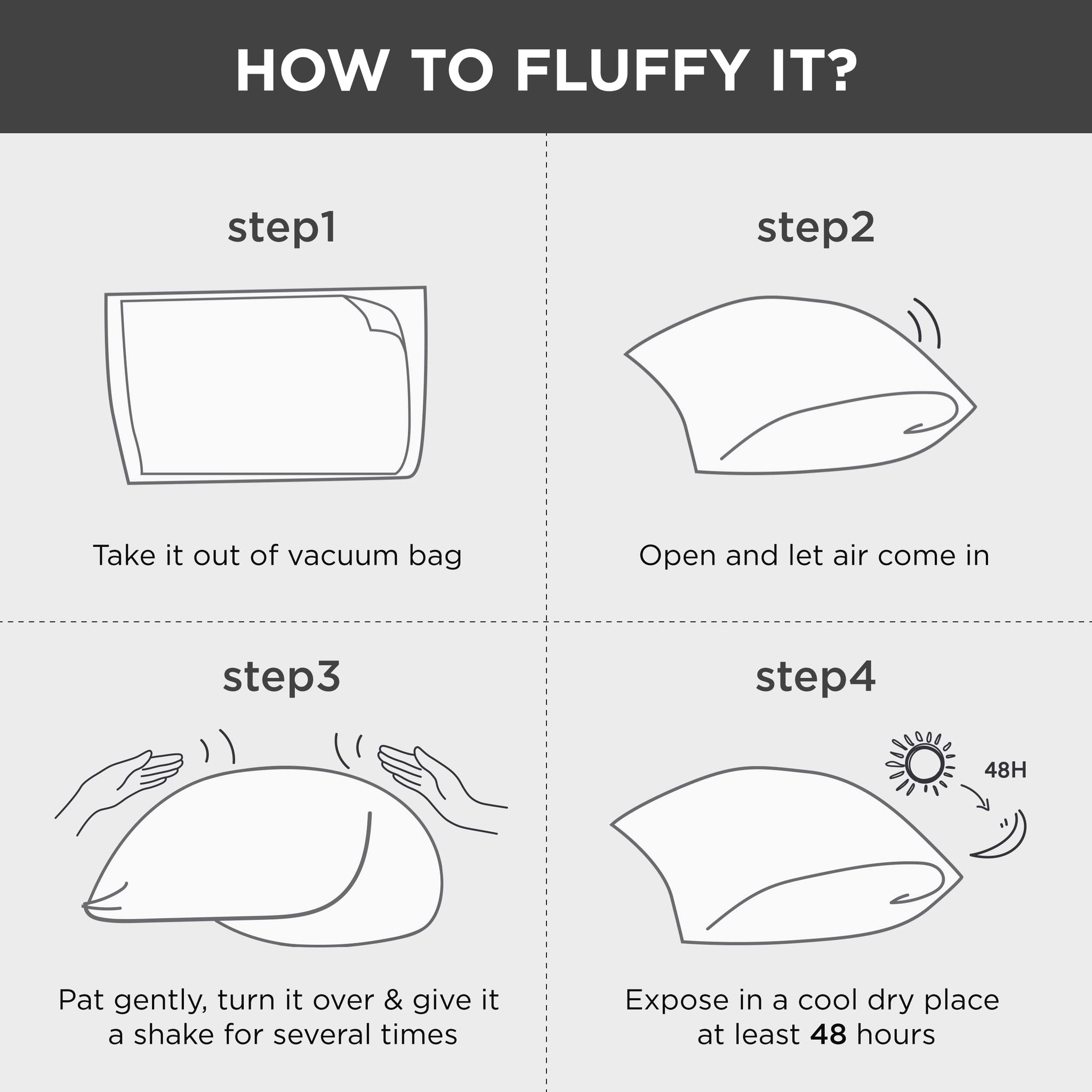 - Warm Tips: Upon unboxing, grab the sides of these pillows and gently shake and pat the pillows to puff up. Allow up to 48 hours for the pillows to regain their max volume. These pillows are machine washable on cold water, and tumble dry low for a like-new restoration