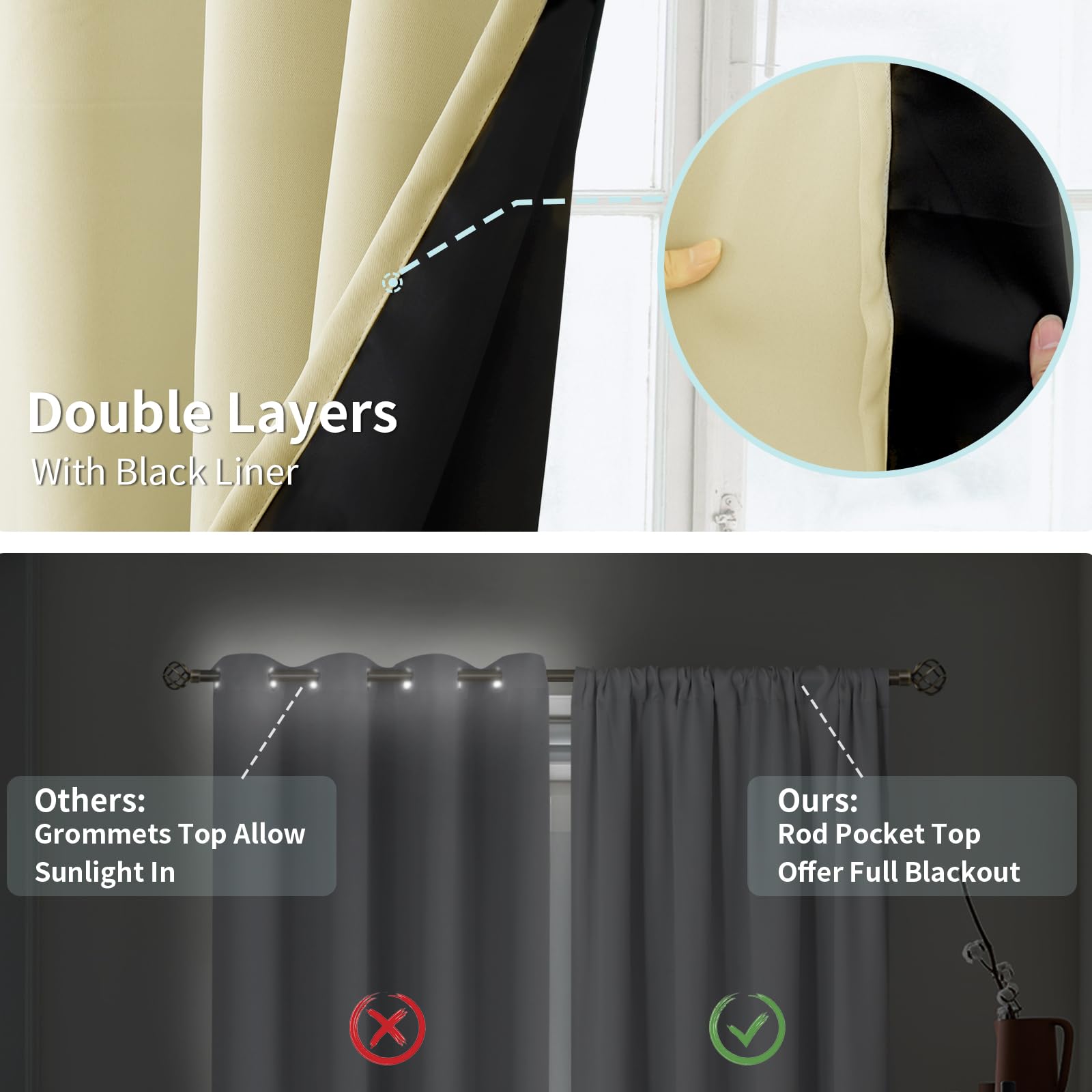 • 100% Blackout Curtains:These high-quality curtains are combined with black backing to make completely black-out curtains that help ward off streetlights and light, creating dark bedrooms and living rooms environment , while also providing better privacy.