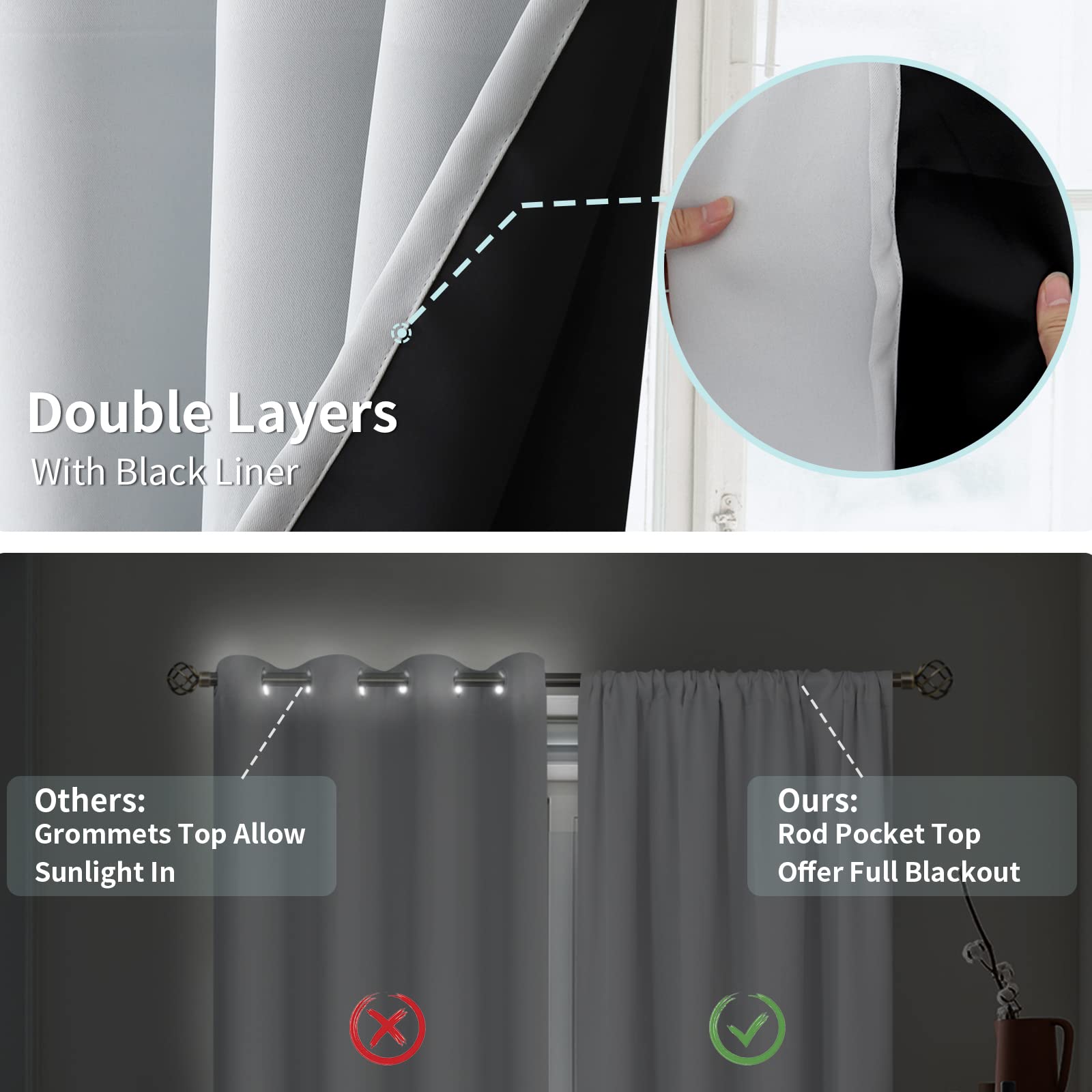 - 100% Blackout Curtains:These high-quality curtains are combined with black backing to make completely black-out curtains that help ward off streetlights and light, creating dark bedrooms and living rooms environment , while also providing better privacy.