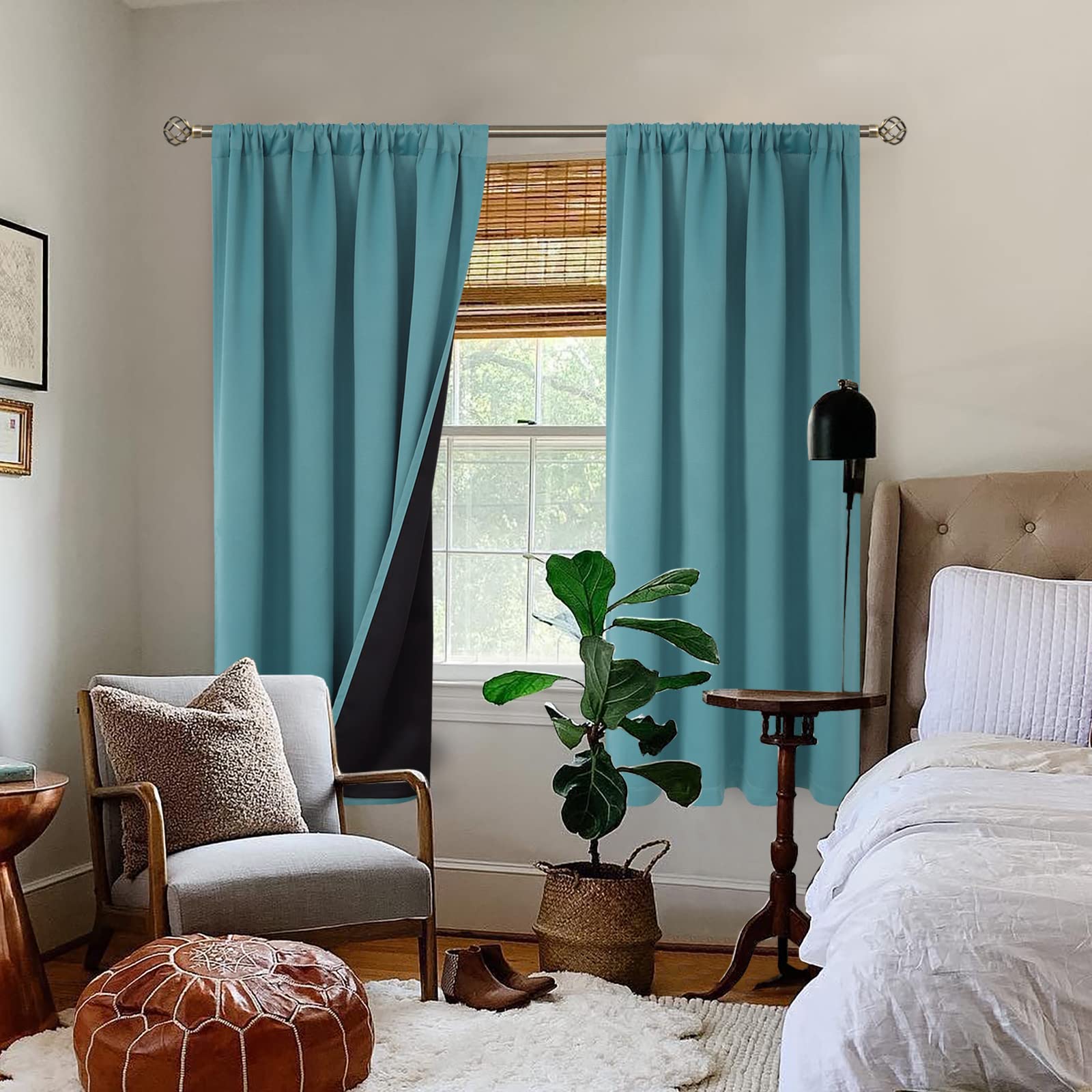 - Package Includes: Sea teal 100% blackout curtains 63 inches length 2 panels set. Each curtains panel is 52 inches wide (a pair is 104" W x 63" L) and room darkening curtains with a 3-inch rod pocket at the top, fits most curtain rods.