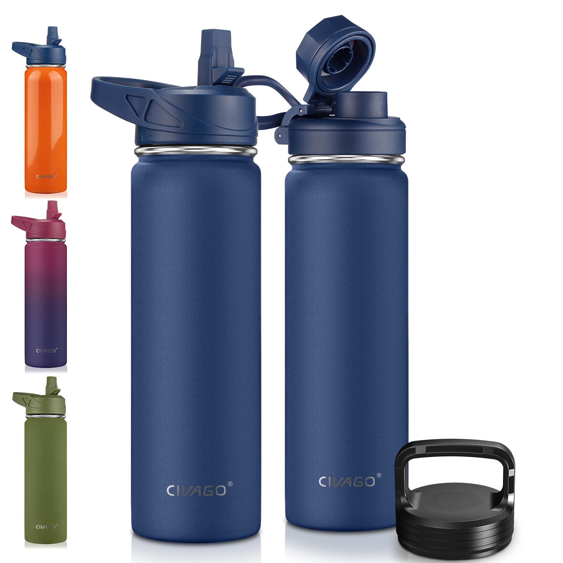• Load image into Gallery viewer, CIVAGO 22 oz Insulated Water Bottle With Straw, Stainless Steel Sports Water Flask Cup with 3 Lids (Straw, Portable Spout and Handle Lid), Double Walled Travel Thermal Canteen Mug, Navy Blue