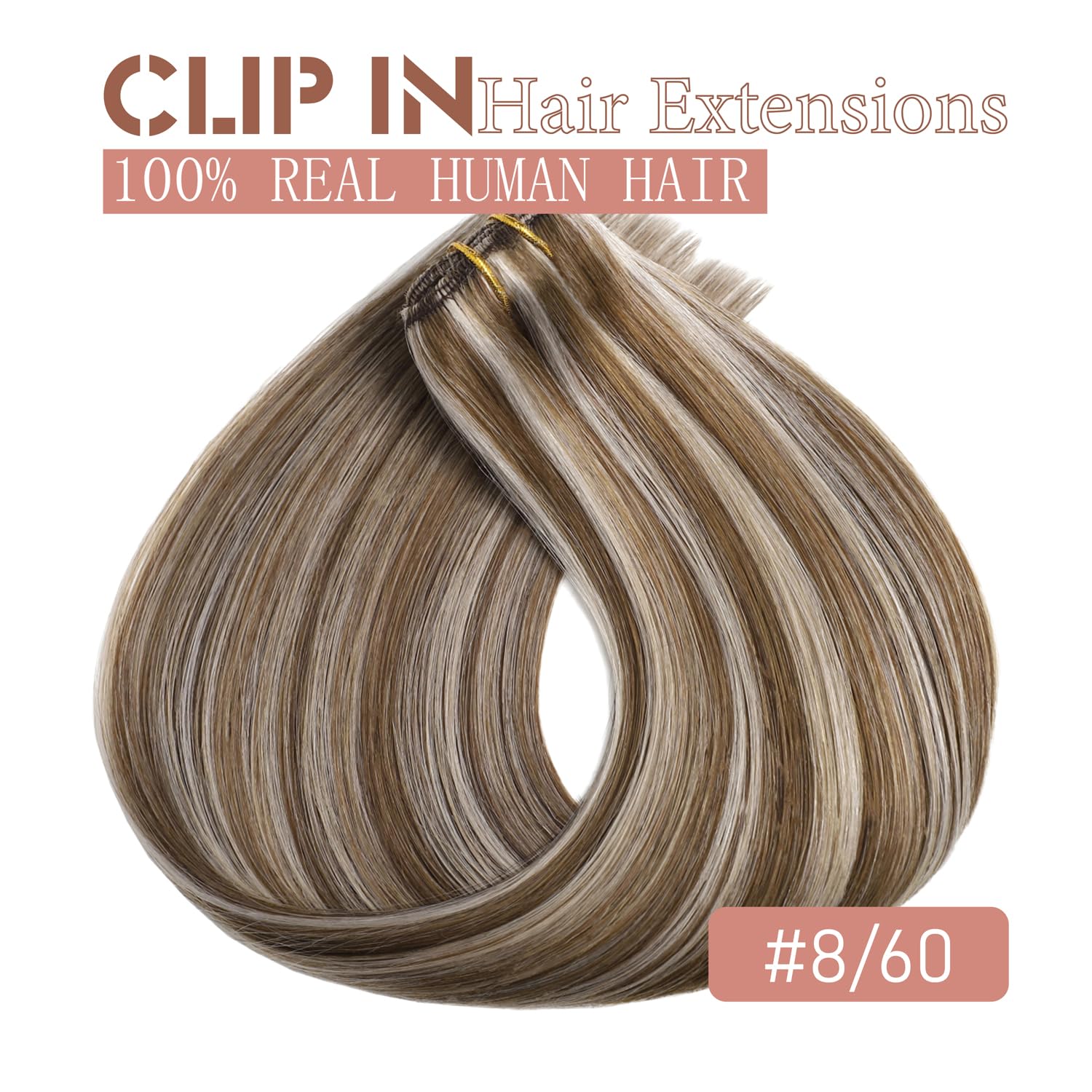 Clip in Hair Extensions #8/60 Balayage Chestnut Blonde Highligh 14 Inch Clip ins Hair Extensions for Women 80g/2.82oz 5pcs Real Human Hair Extensions Easy to Install