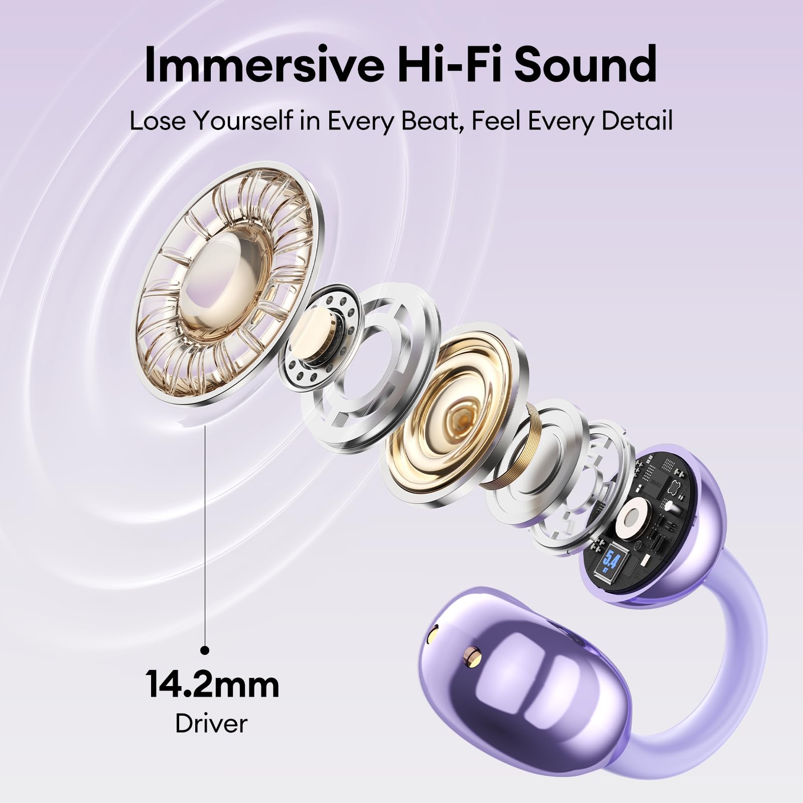 - Immersive Hi-Fi Sound & Crystal-Clear Calls: Powered by 14.2mm dynamic drivers and ENC noise reduction technology, these clip on headphones deliver studio-grade audio with deep bass and crisp vocals. Advanced directional audio ensures zero sound leakage, while dual mics block 90% background noise for face-to-face call clarity even in windy environments