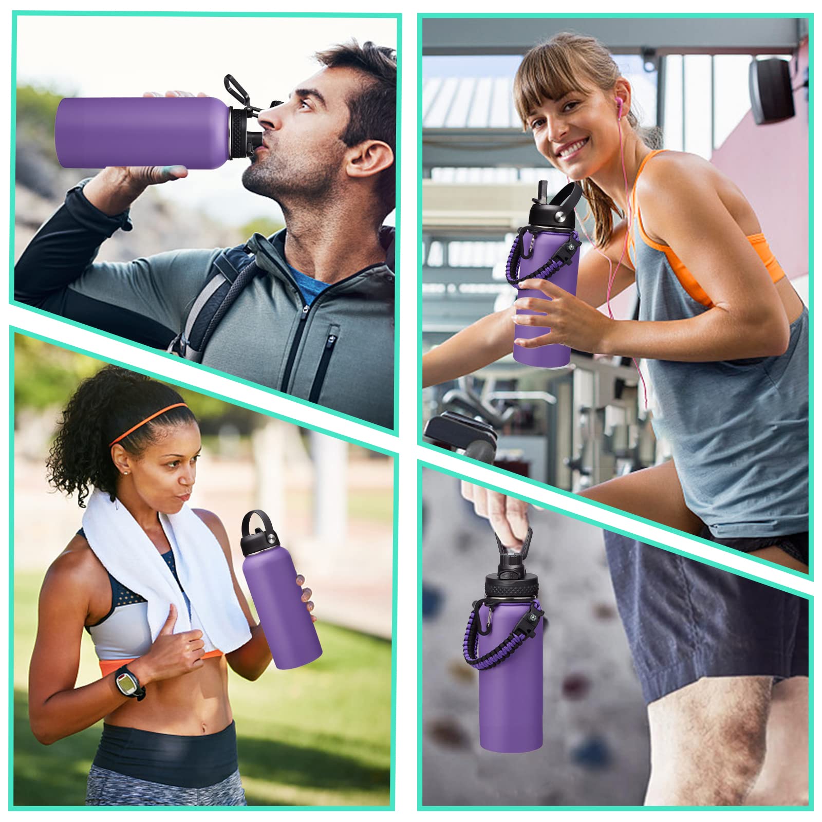 - SUPER JOYFUL COMBO: Buy 32oz insulated water bottles and get 9 accessories (2 x lids, 1 x survival paracord, 1 x carrying pouch, 1 x shoulder strap, 1 x protective cup mat, 2 x straws, 1 x straw brush). WITH A LIFETIME GUARANTEE, these thermal water bottles are perfect gifts for using at home, work, school, road trips, hiking, sporting events, or just hanging out