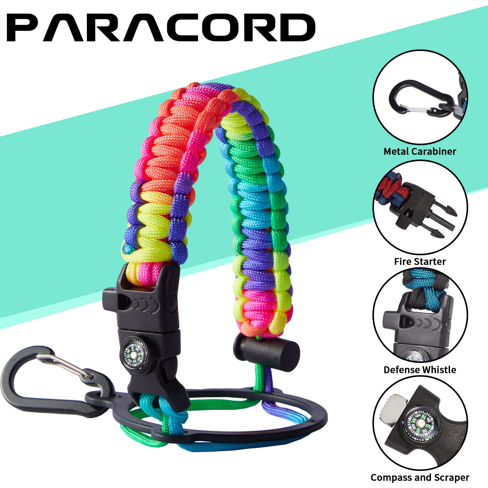 - UNIQUE DESIGNS PARACORD HANDLE: Full-function paracord handle made in individual styles to match the color of the flask water bottles. With compass, safety ring, carabiner, flint fire starter & whistle. It unravels into a sturdy and taut rope in an emergency, making the large water jug an ideal survival kit for expeditions in the wild