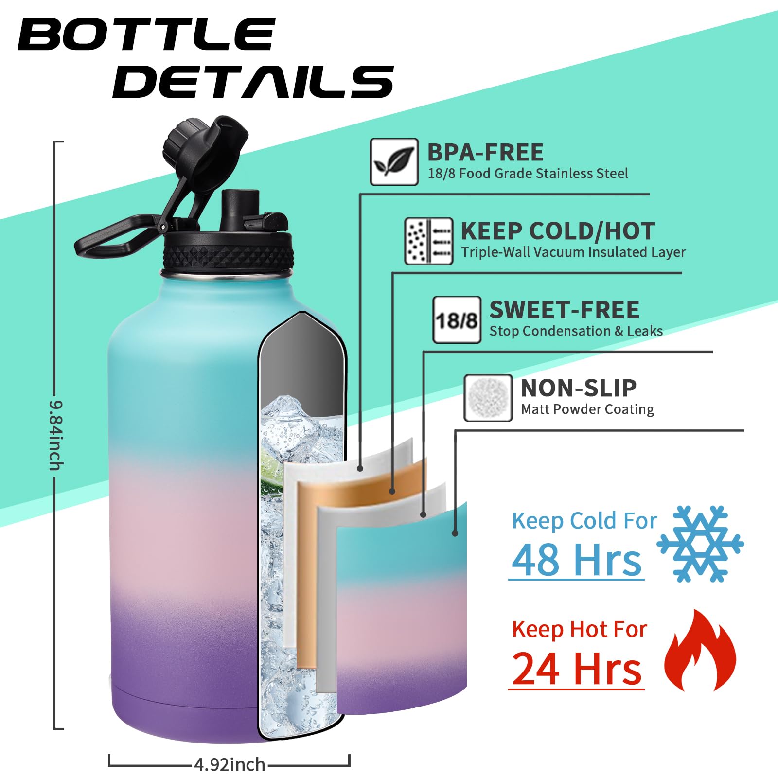 - TRIPLE-INSULATION & HIGH-PERFORMANCE: This wide mouth 1/2 gallon water bottle features triple-wall vacuum insulation and pro-grade stainless steel, it keep-cold for 48 hrs and keep-warm for 24 hrs without altering the taste and keeps your water tasting fresh. Using this metal water bottle on hot summer days or your next camping trip to stay hydrated all the day