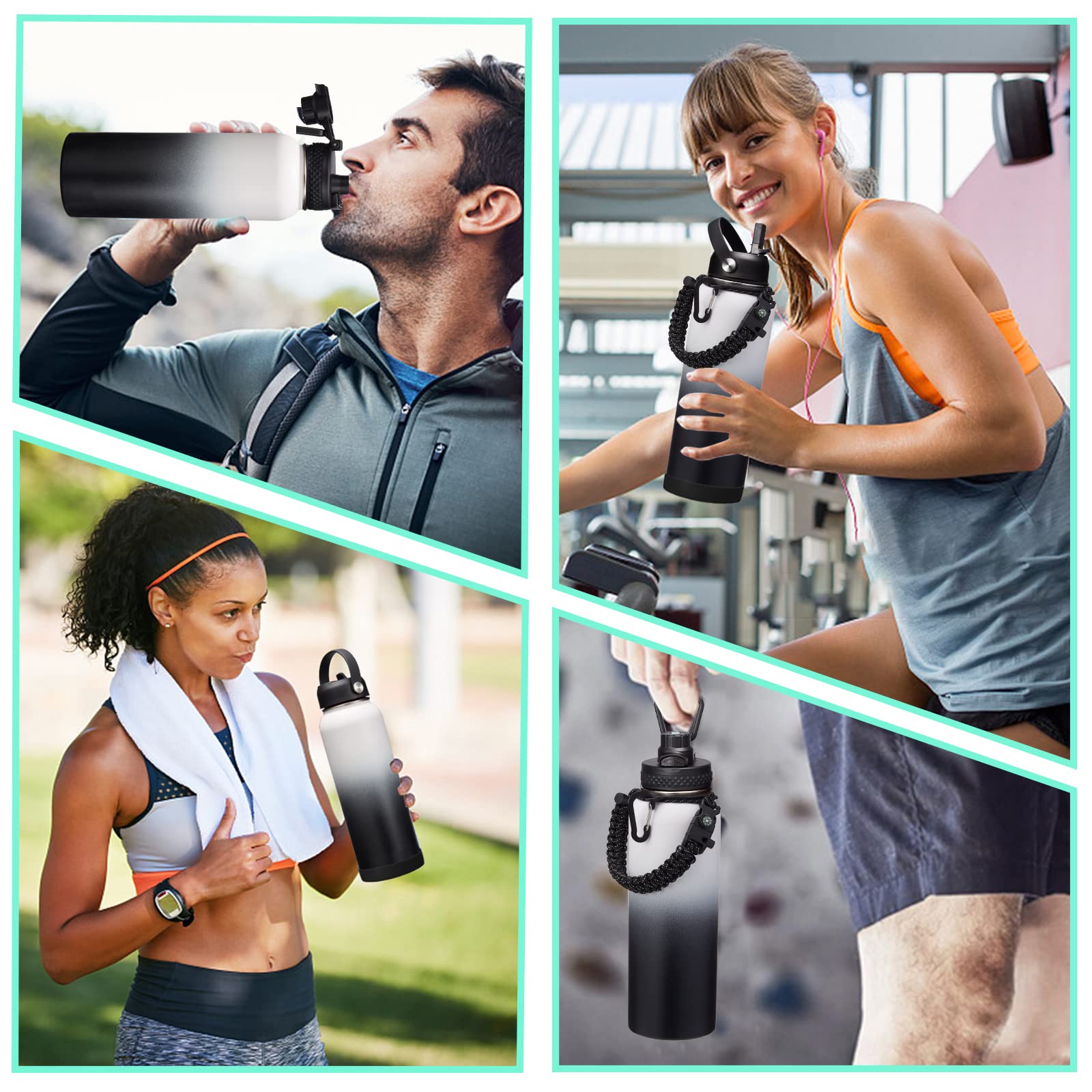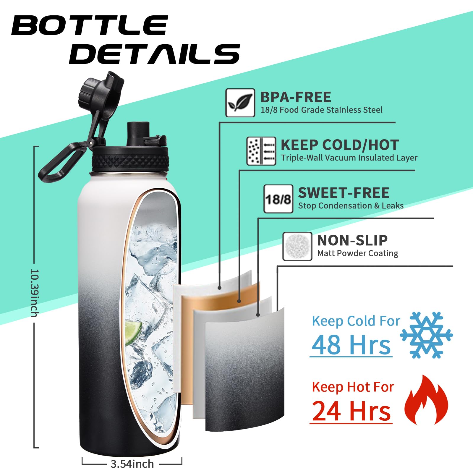 • QUALITY—Latest Vacuum Insulated: metal water bottle featuring double-wall & food-grade 18/8 stainless steel with superior insulation & anti-condensation, keeping your beverages stay ICE COLD for 48-Hours & HOT for 24-Hours for a fresh taste. In addition, the outer layer with non-slip powder coating ensures drinking bottles won't sweat & that keeps it from slipping