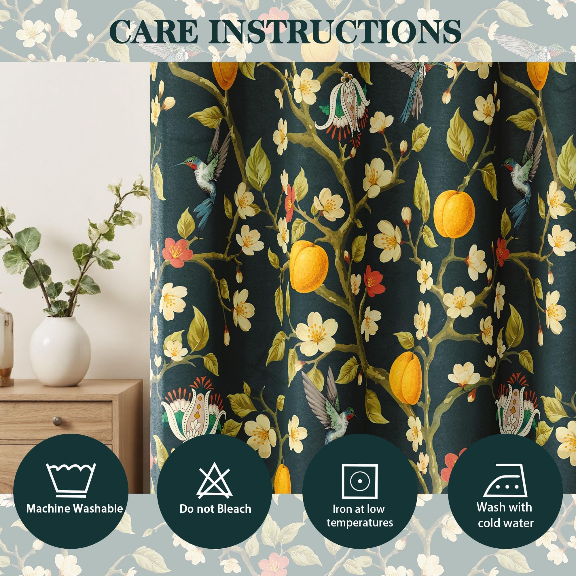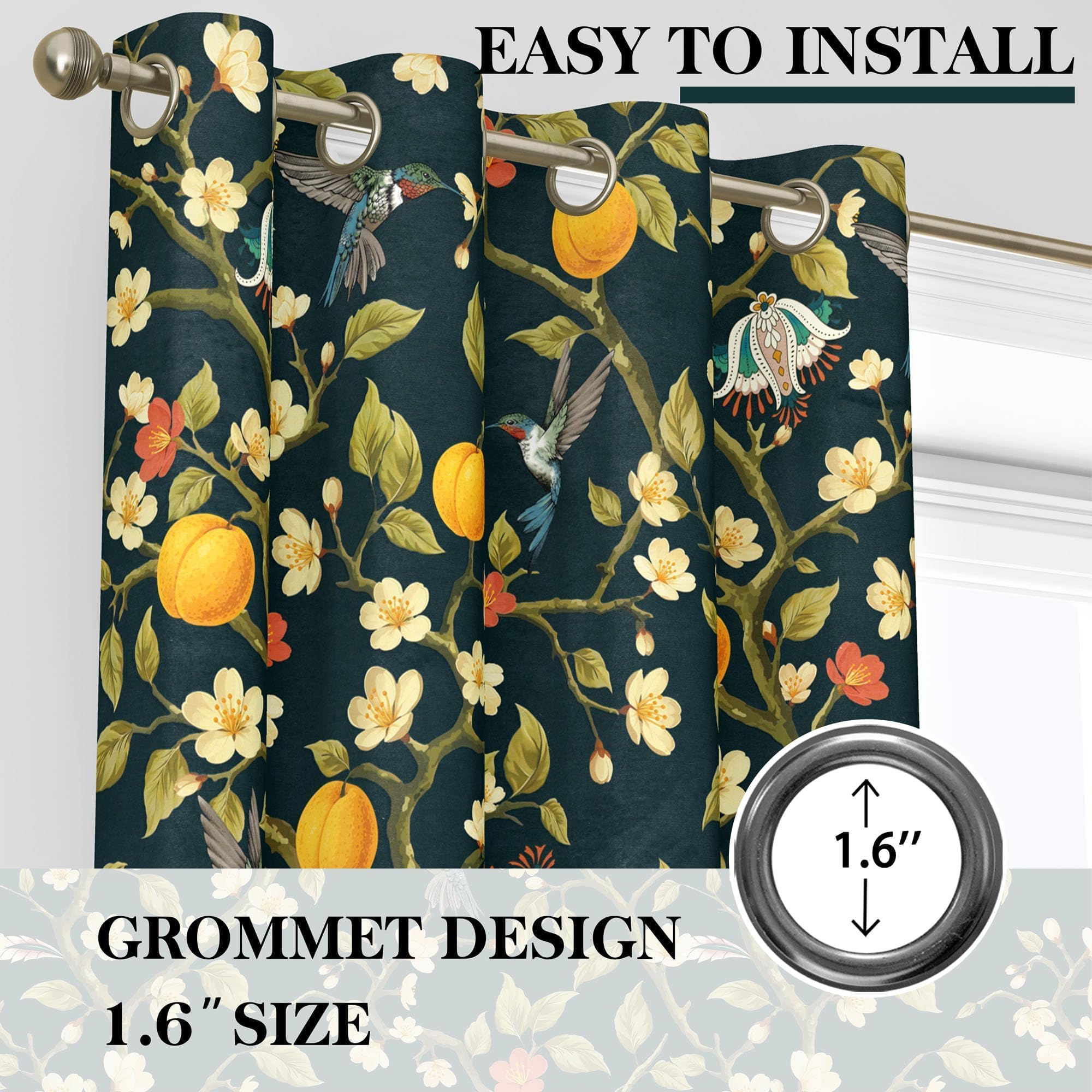 - Patterned Design: Tyrot blackout curtains showcase a vibrant printed design featuring florals, leaves, apricots, branches, and hummingbirds. Perfect for bedroom or living room use, these eye-catching curtains add a lively, luxurious touch to your home décor.