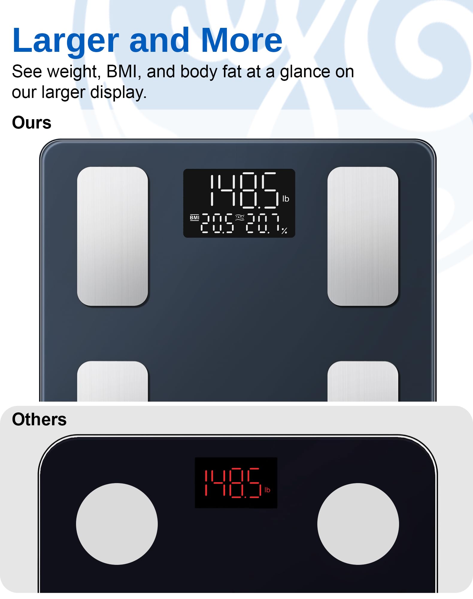 - Instant On-Scale Results – See Weight, BMI & Body Fat Immediately: Step on the scale and get three essential body metrics displayed right on the bright LED screen—no phone needed after initial setup. Instantly view accurate measurements of your weight, BMI, and body fat percentage with every weigh-in. Designed for convenience and clarity, the large, high-contrast digits are easy to read in any lighting, making it perfect for daily use and quick health feedback