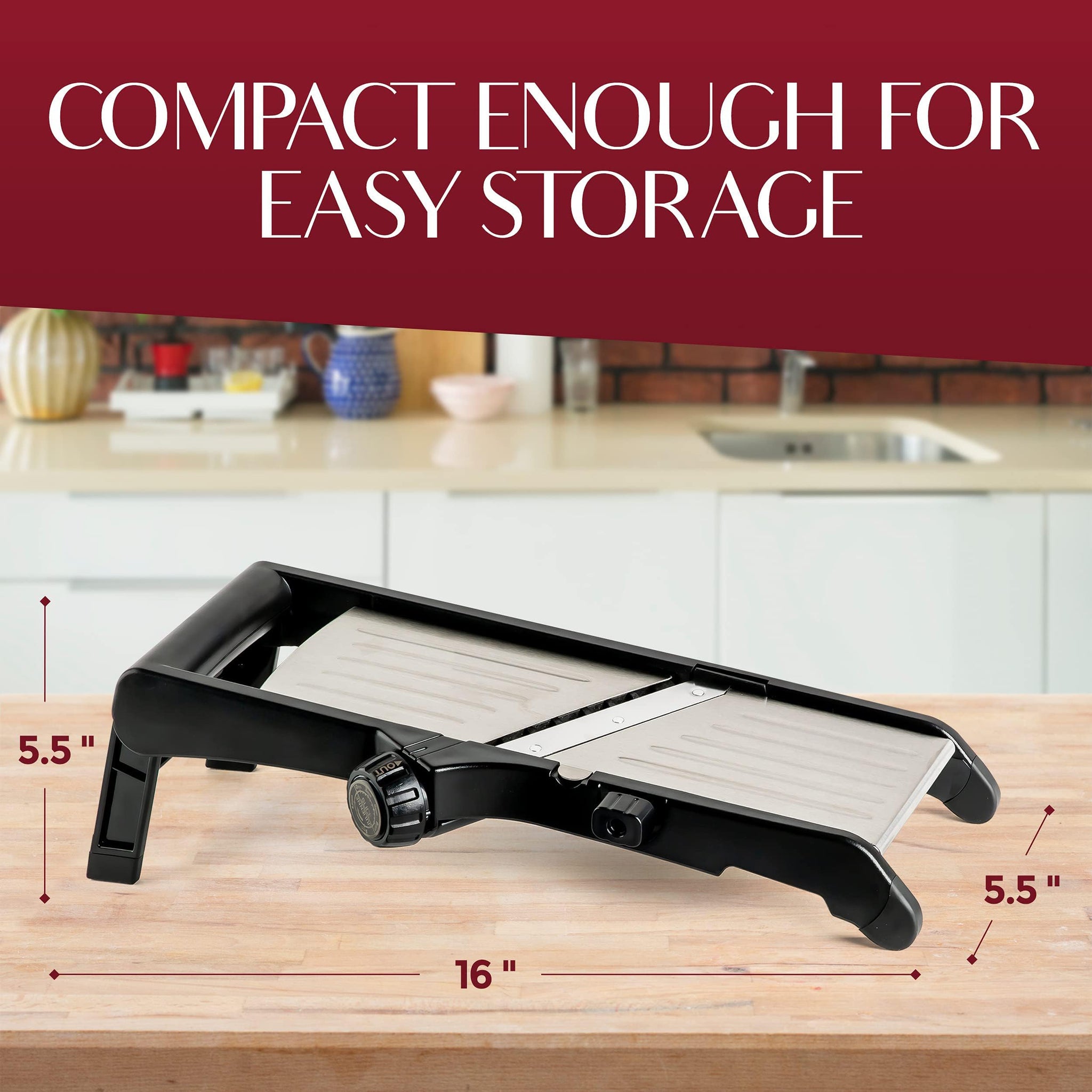 • Our ADJUSTABLE BLADE dial ends fumbling for accessories and storage headaches. No hunting through your kitchen junk drawer for your favourite blade! All slicing options are built on our device. Slice from paper-thin to 9mm thick. Two julienne settings - 4.5mm and 9mm. Also makes WAFFLE FRIES or RUFFLED POTATO CHIPS. NO TOUCHING BLADE to change it out. Our cutter makes quick, healthy veggie-based meals, potato chips or French fries FAST AND SAFE. Unit folds flat for easy storage in a drawer.