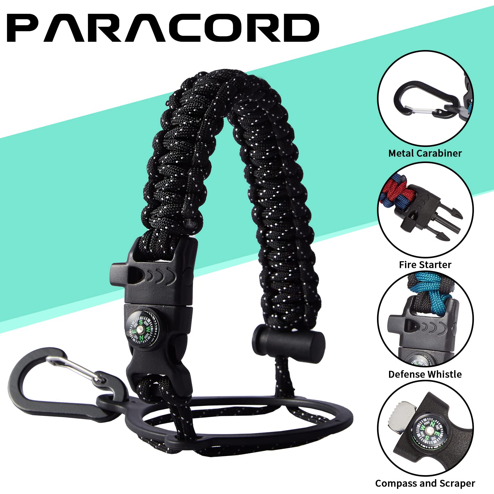 - UNIQUE DESIGNS PARACORD HANDLE: Full-function paracord handle made in individual styles to match the color of the flask water bottles. With compass, safety ring, carabiner, flint fire starter & whistle. It unravels into a sturdy and taut rope in an emergency, making the large water jug an ideal survival kit for expeditions in the wild