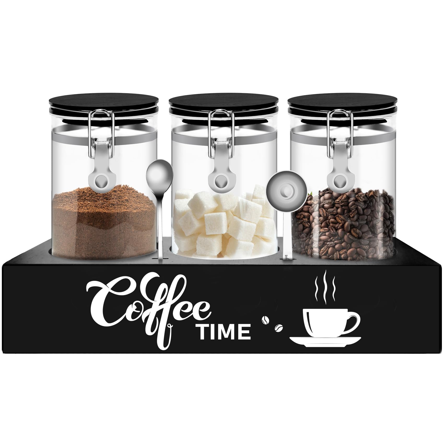 • PERFECT GIFT FOR COFFEE LOVERS: With its elegant glass jars, wooden shelf, and spoons, this coffee storage container makes a thoughtful gift for housewarmings, birthdays, or any occasion
