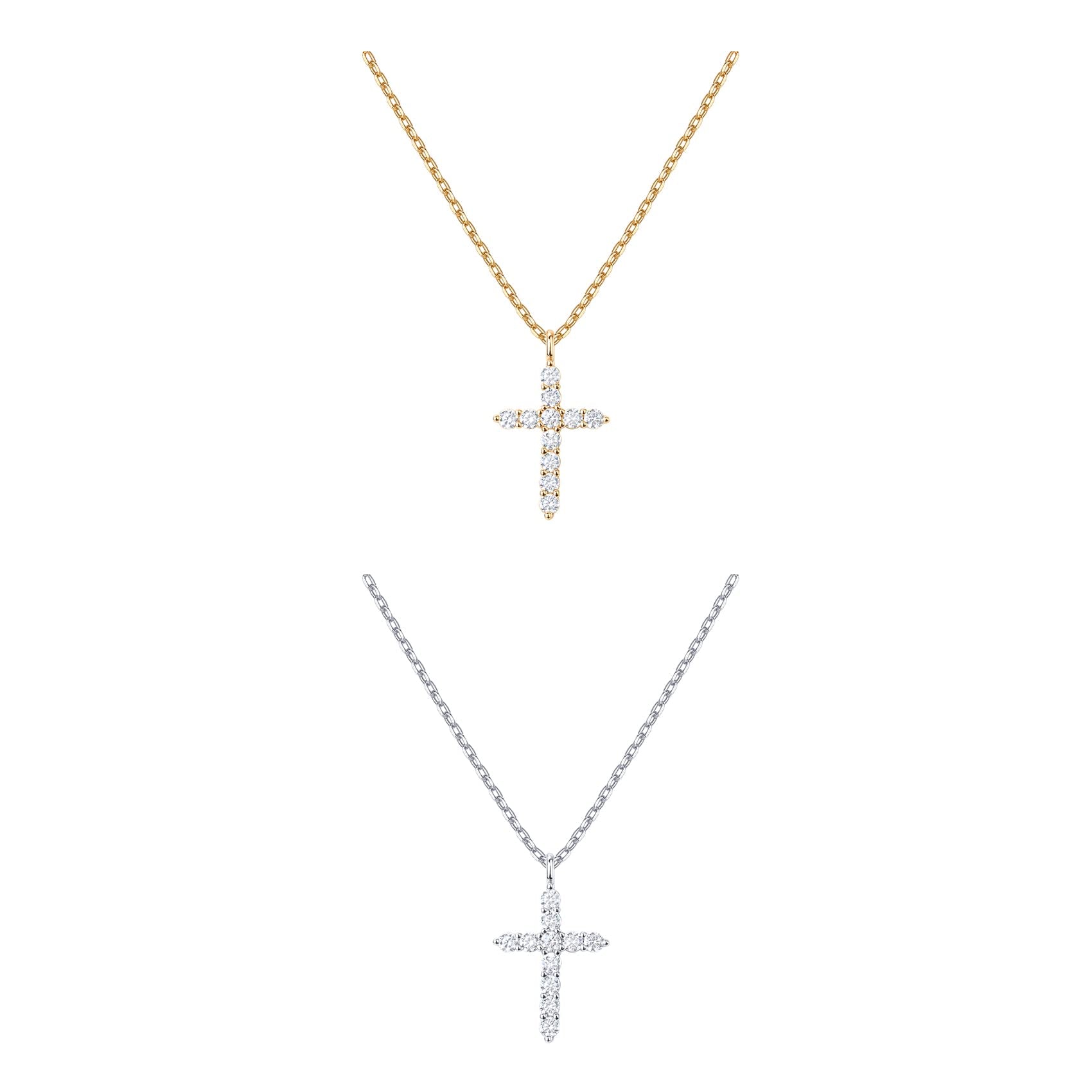 - HIGHLIGHTS: This women's cross-shaped faith necklace is crafted from hand-selected AAAAA-quality cubic zirconia. The pack includes two 19-inch sliding chain necklaces: one rhodium-plated and one 14K yellow gold-plated, both designed to comfortably fit all neck sizes.