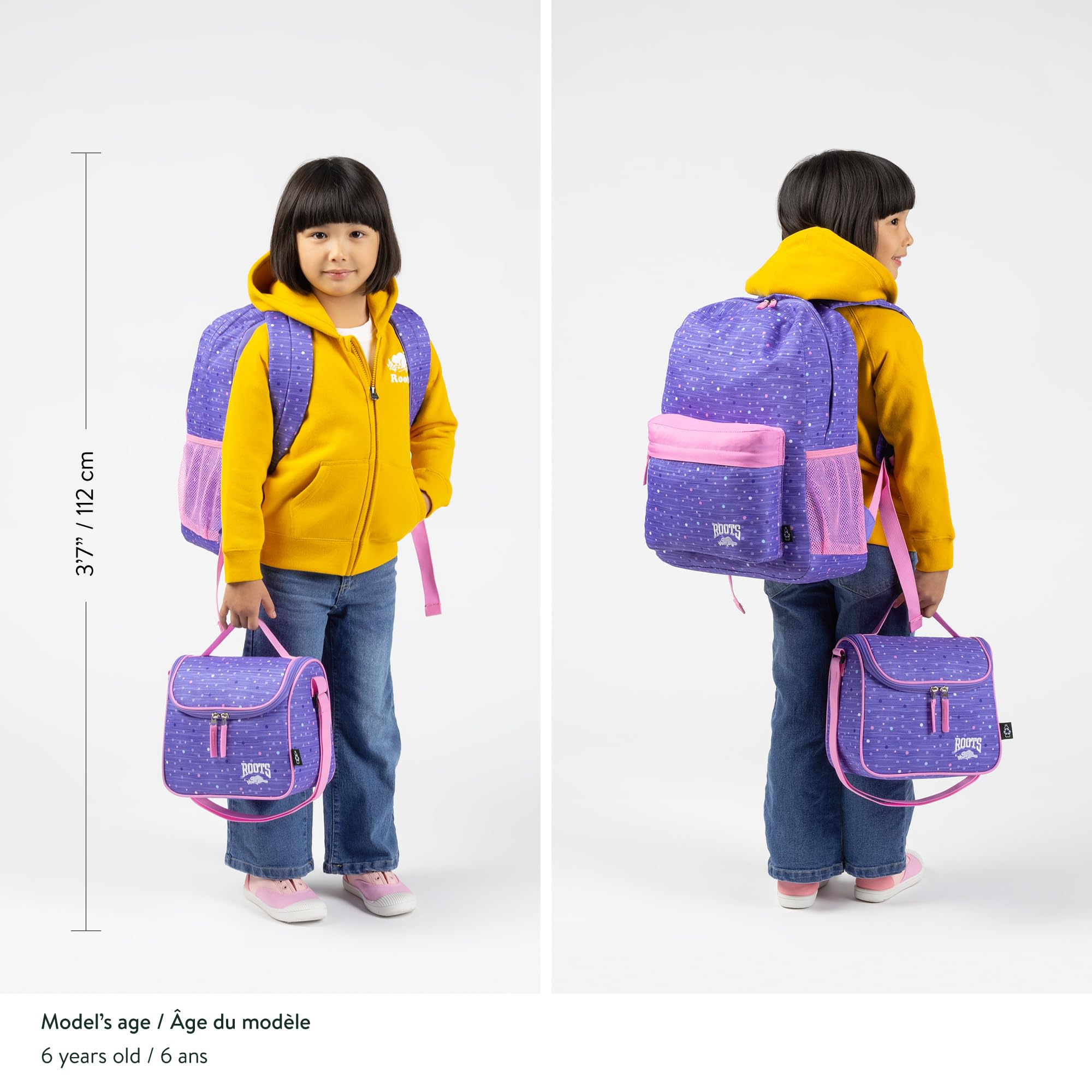 The Roots Essential 3-in-1 Matching Kids Set is the ultimate back-to-school companion, combining durability, comfort, and functionality for everyday use. Designed for young students, this versatile set includes a weather-resistant backpack, an insulated lunch bag, and a spacious pencil case, ensuring all essentials stay protected and organized throughout the day. The backpack, made from recycled polyester, features a rain flap over the main zipper to help keep belongings dry, while its padded back support and adjustable shoulder straps provide all-day comfort. With a 22.5L capacity, it offers ample space for books, notebooks, and extra layers. The front pocket is perfect for quick access to your items, while the side mesh pocket securely holds your water bottle. Reflective accents on the front pocket and shoulder straps enhance visibility for added safety. The BPA-free insulated lunch bag keeps food fresh for hours with its wide-bottom design for extra stability and an easy-to-clean lining for quick maintenance. Its 5L capacity ensures room for balanced meals, snacks, and drinks. Completing the set, the 2.5L pencil case holds up to 200 pens or pencils, keeping school supplies neatly organized. Tested above industry standards and backed by a 2-year limited warranty, this set is stylish, practical, and built to last!