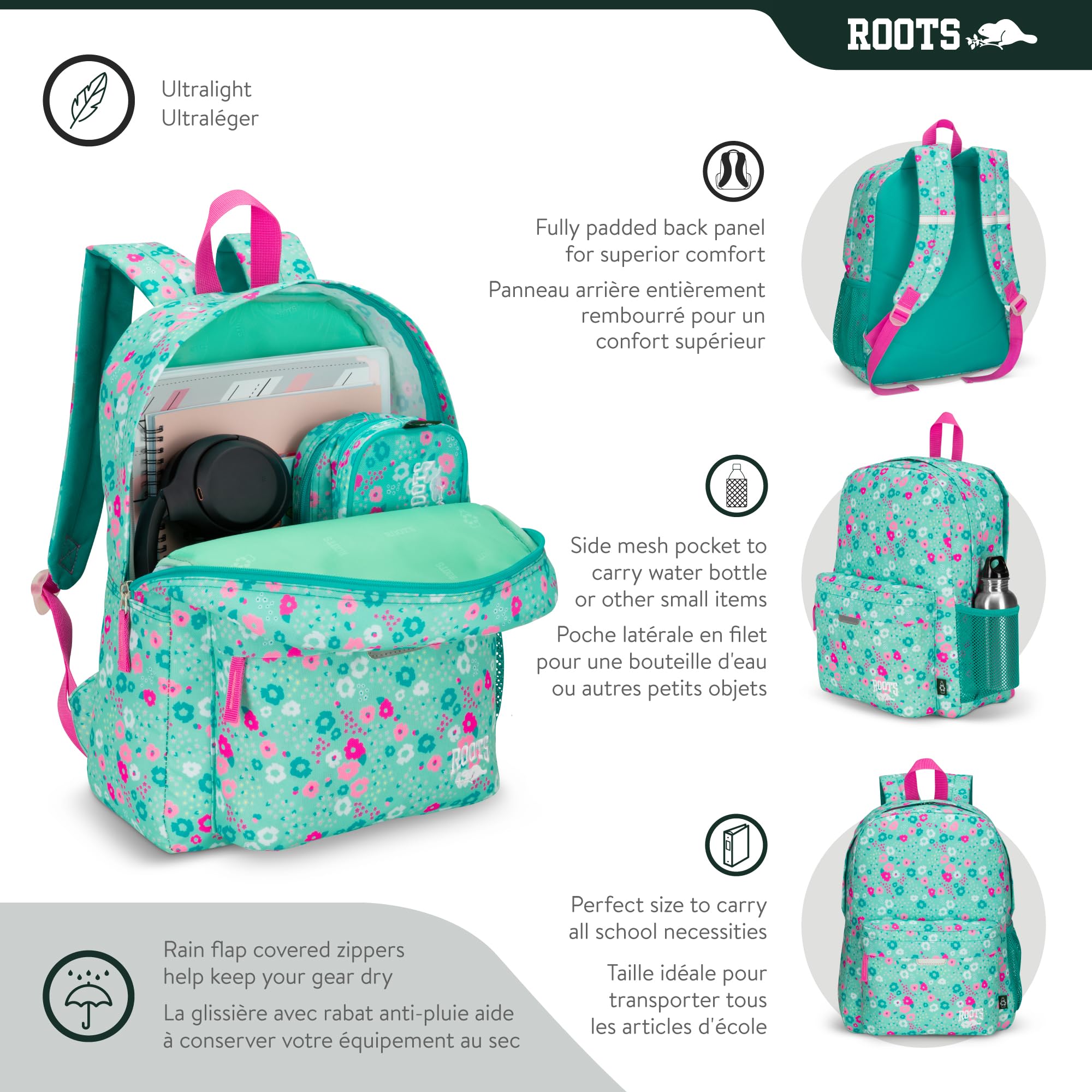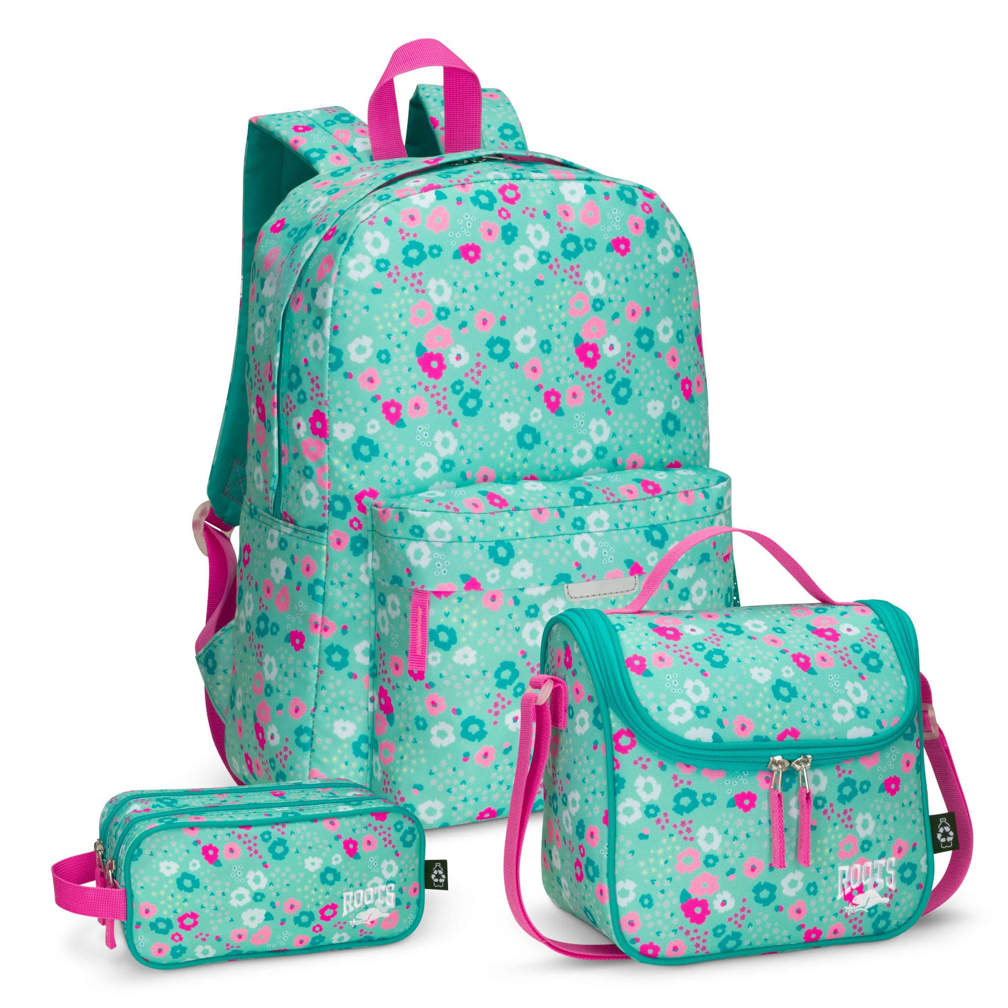 Roots Essential 3-in-1 Matching Water Resistant Kids Backpack and Lunch Bag Set with Bonus Pencil Case - Made from 100% Recycled Fabrics -22.5 litres, Ditsy Floral Mint