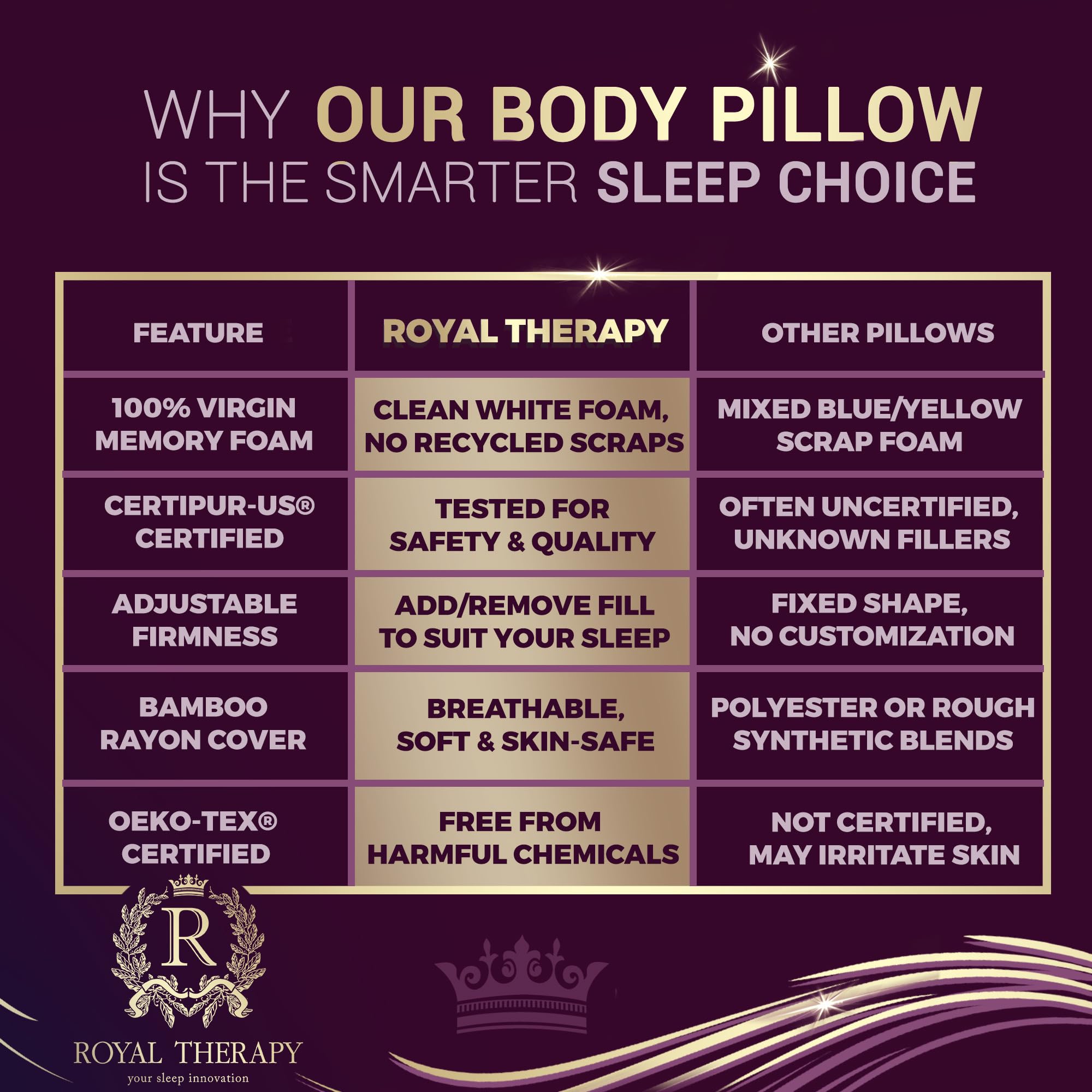 Details: The Royal Therapy Long Body Pillow is more than a luxuryβitβs a wellness essential. Designed for adults, side sleepers, expectant mothers, and even growing kids, it offers full-body alignment that redefines how sleep should feel. Whether you're recovering from injury, preparing for birth, or just tired of waking up sore, this pillow adjusts with you.