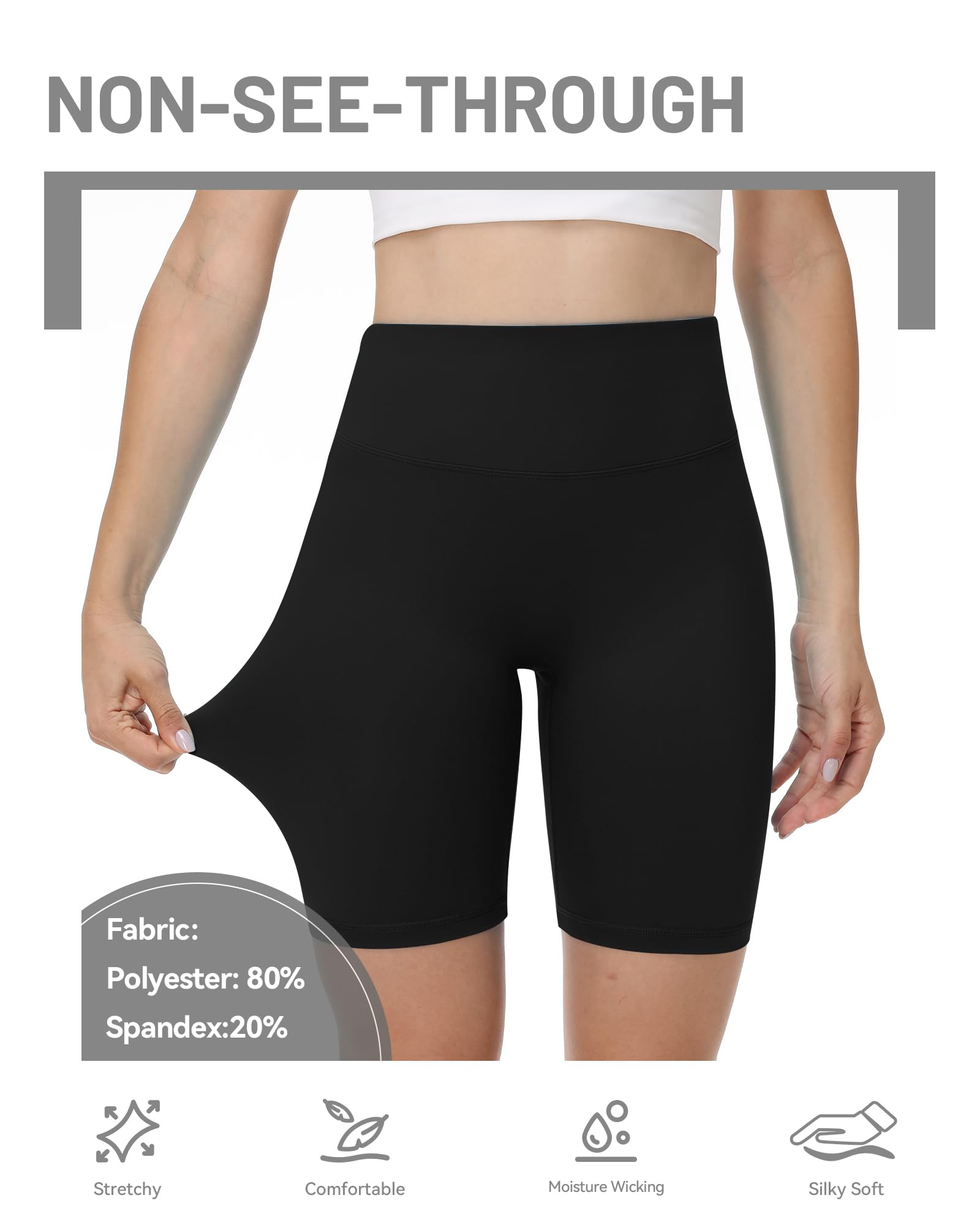 - Non-See-Through : Women workout shorts are made with an updated non-transparent fabric, containing 80% polyester and 20% spandex,perfectly contouring to your thighs, They don’t ride up, non see-through, squat proof accidental exposure