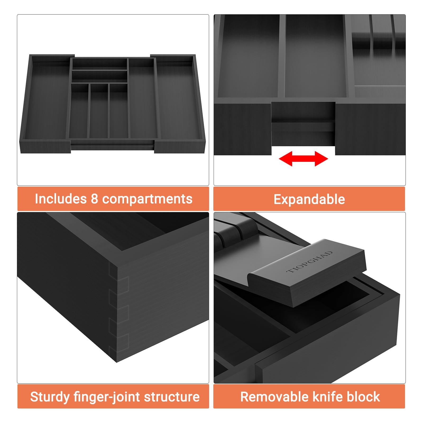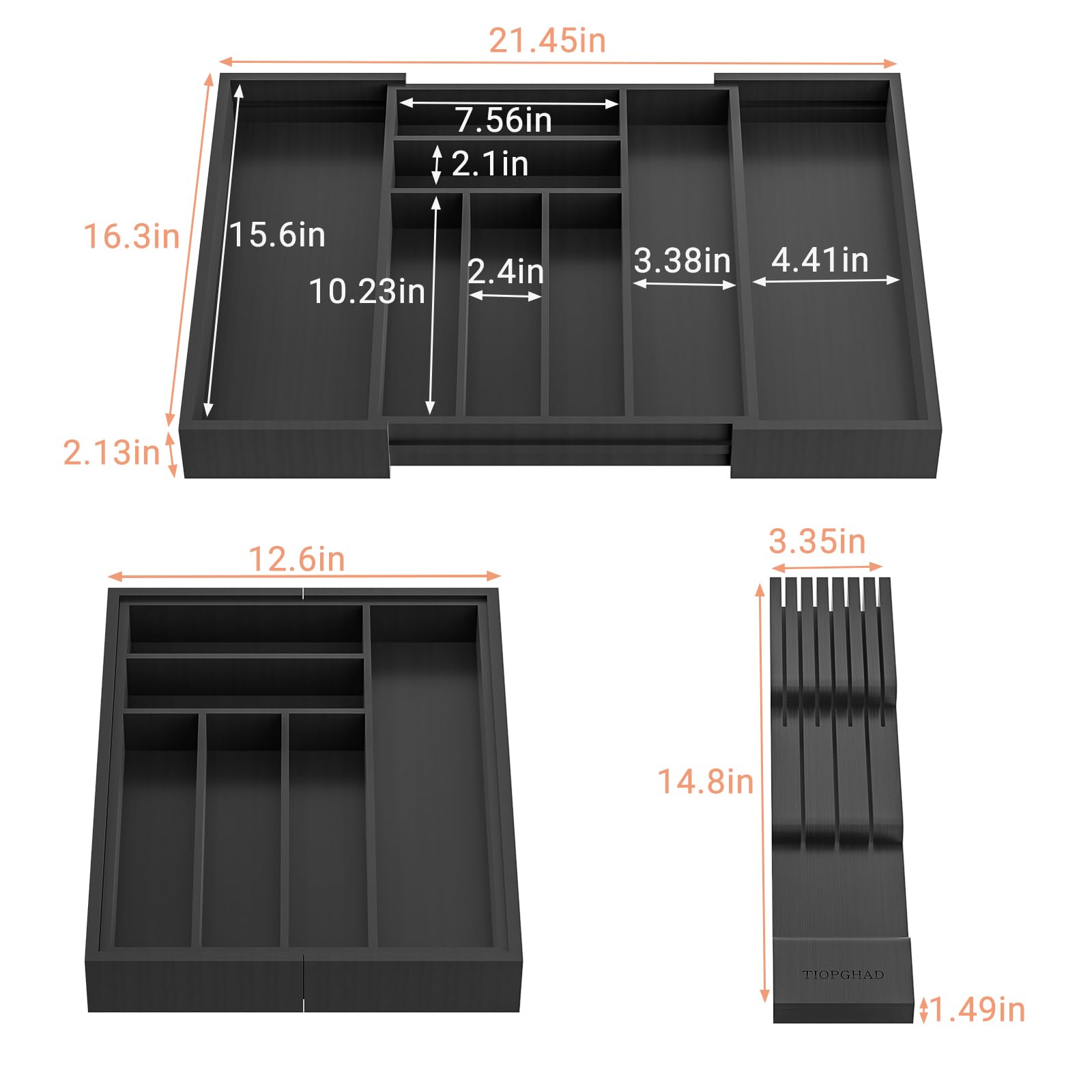 - 【Expandable】: The drawer organizer can expand from 12.6 inches to 21.45 inches wide, fitting most drawers and maximizing drawer storage space. When fully extended, it fits drawers up to 23 x 3 x 18 inches, and when fully collapsed, it fits drawers up to 14 x 3 x 18 inches. It features up to 8 compartments, keeping your drawers tidy, convenient, and practical, making it easy to find what you need