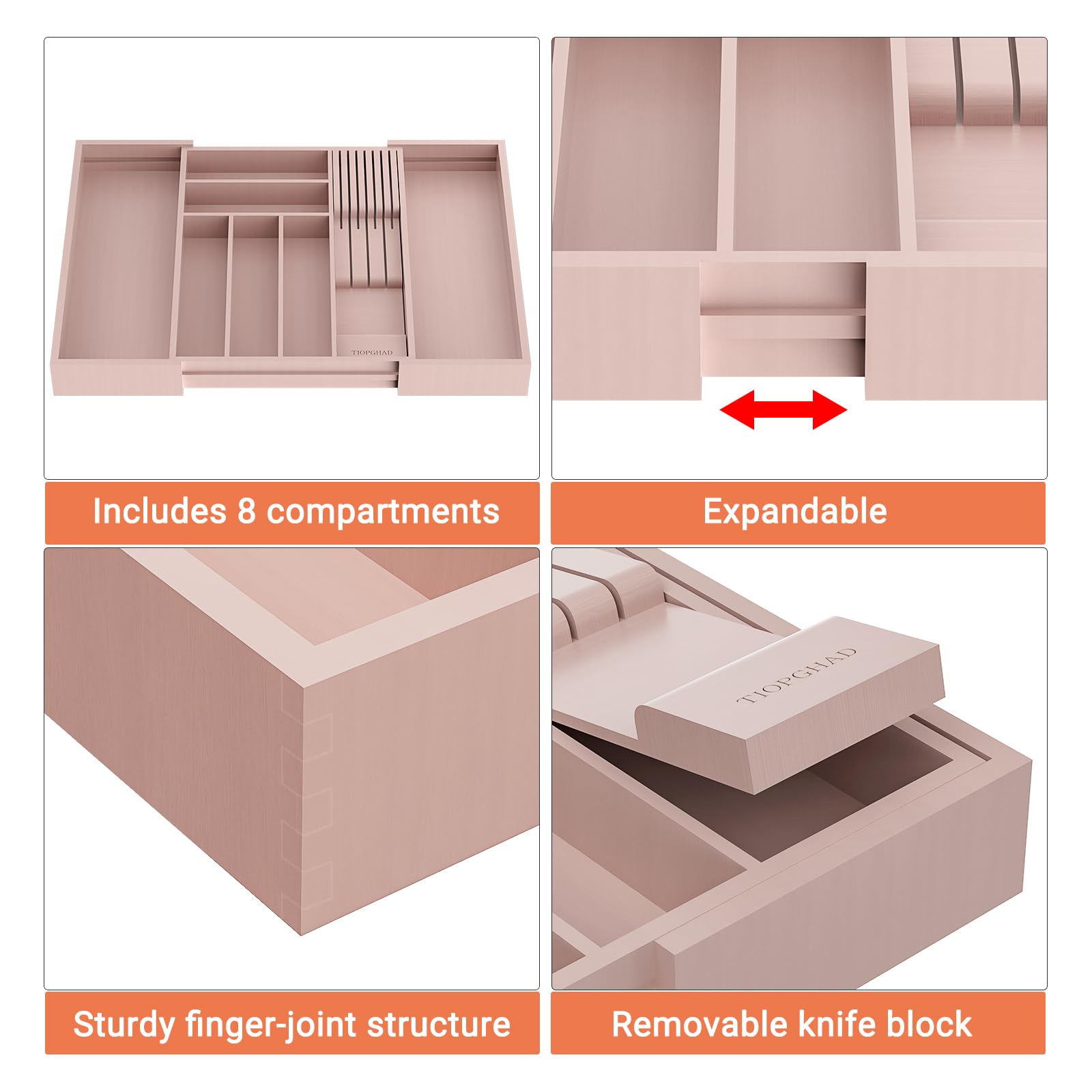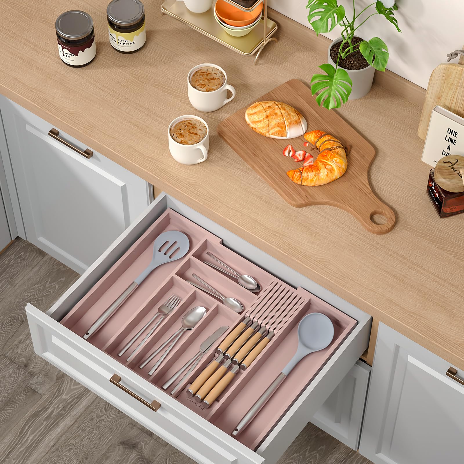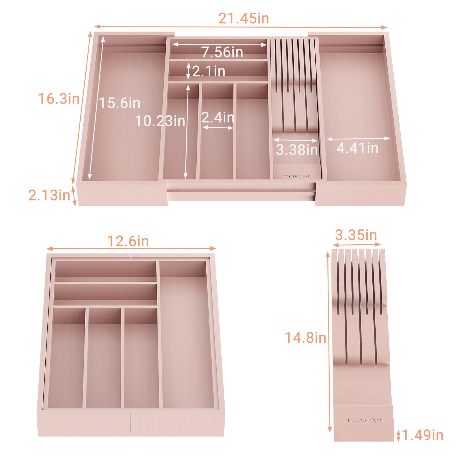 - 【Expandable】: The drawer organizer can expand from 12.6 inches to 21.45 inches wide, fitting most drawers and maximizing drawer storage space. When fully extended, it fits drawers up to 23 x 3 x 18 inches, and when fully collapsed, it fits drawers up to 14 x 3 x 18 inches. It features up to 8 compartments, keeping your drawers tidy, convenient, and practical, making it easy to find what you need