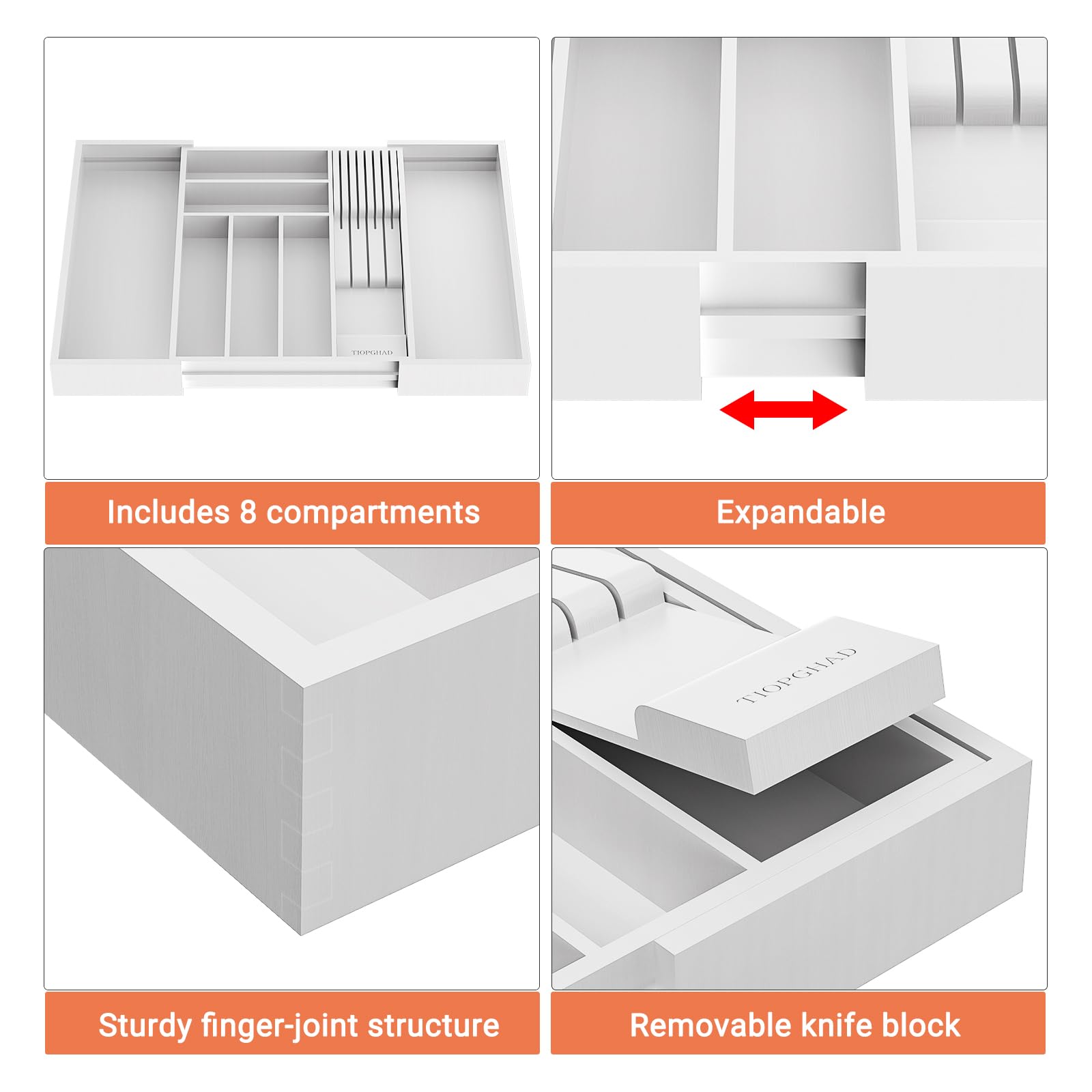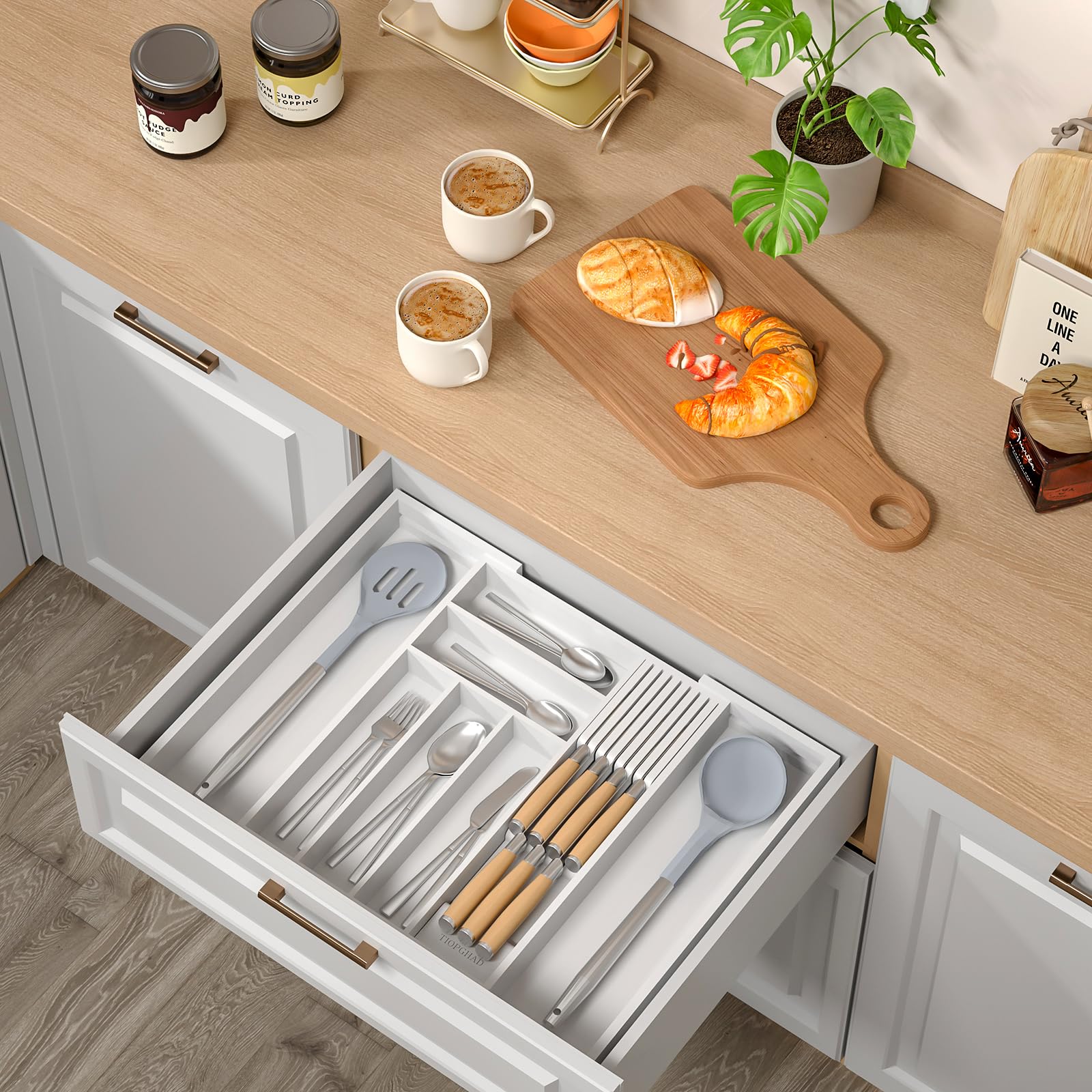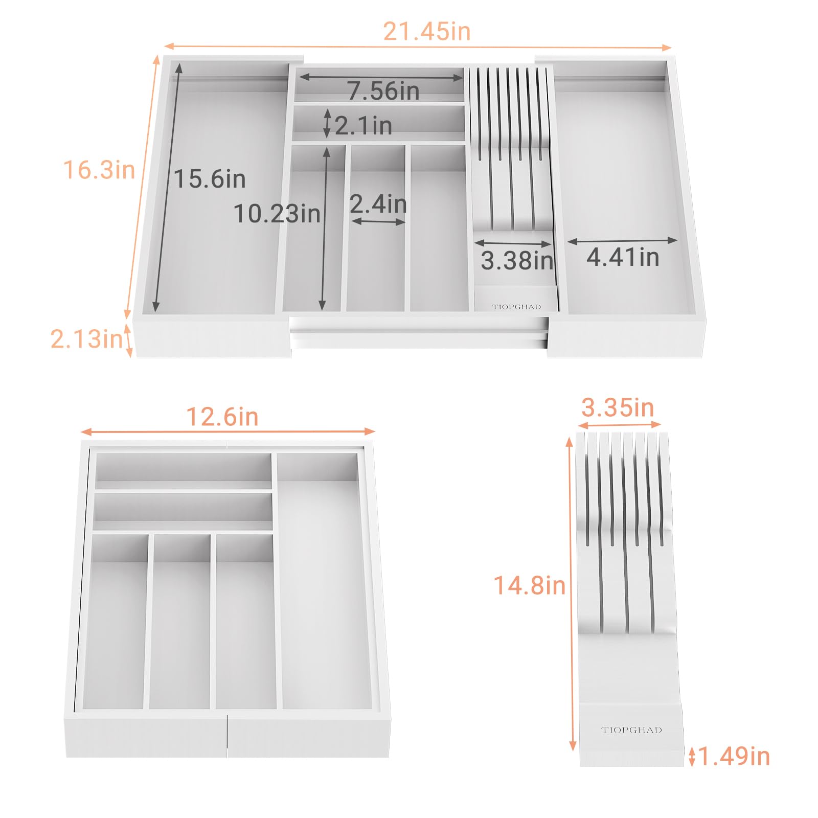 - 【Expandable】: The drawer organizer can expand from 12.6 inches to 21.45 inches wide, fitting most drawers and maximizing drawer storage space. When fully extended, it fits drawers up to 23 x 3 x 18 inches, and when fully collapsed, it fits drawers up to 14 x 3 x 18 inches. It features up to 8 compartments, keeping your drawers tidy, convenient, and practical, making it easy to find what you need
